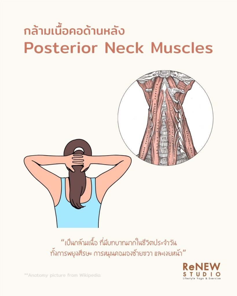 ความสำคัญ:หากกล้ามเนื้อกลุ่มนี้แข็งแรงและยืดหยุ่น จะช่วยให้คอทำงานได้สมดุล ลดอาการเจ็บปวด และช่วยให้ท่าทางโดยรวมดีขึ้น ทั้งในการยืน เดิน นั่ง และการฝึกโยคะ