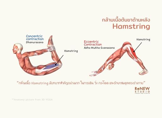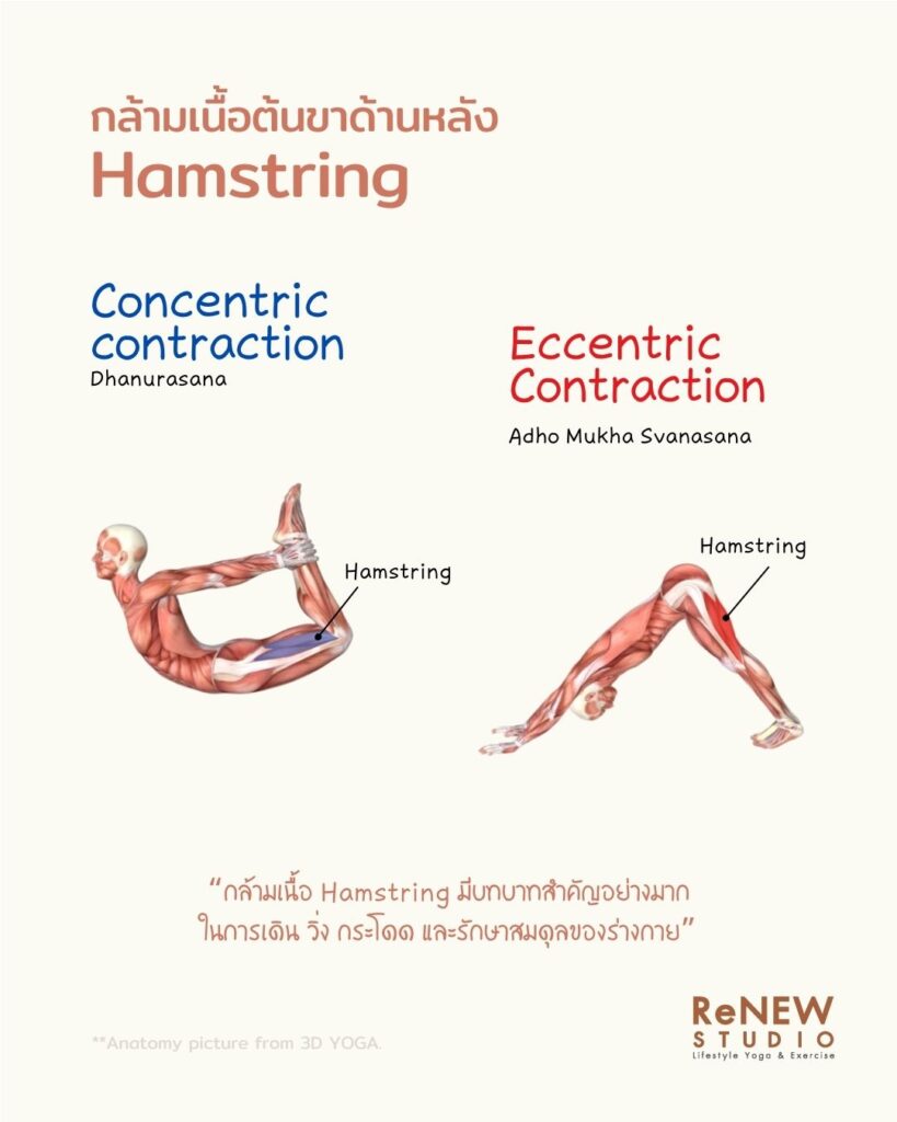 ท่าธนู (dhanurasana) เป็นท่าโยคะที่ใช้งาน Hamstring แบบ Concentric Contraction (หดตัวแบบสั้นลง) มีส่วนช่วยกระตุ้นการทำงานของกล้ามเนื้อ Hamstring ในลักษณะของการหดตัว