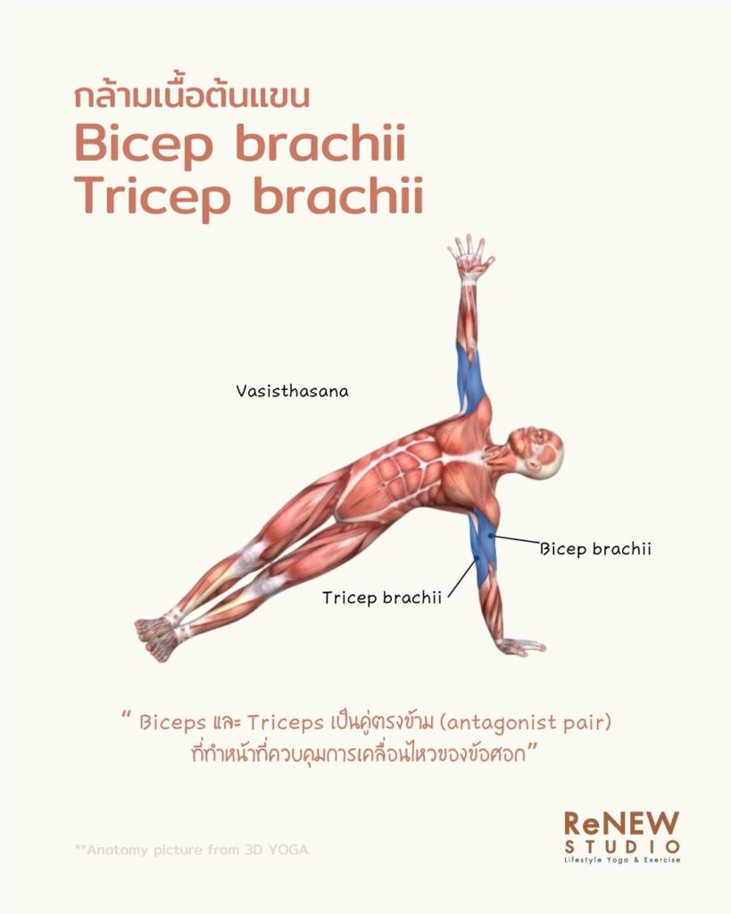 -ท่า Chaturanga Dandasana Triceps ทำงานแบบ concentric เพื่อควบคุมการเหยียดข้อศอก ส่วน Biceps ทำงานแบบ eccentric เพื่อต้านแรงโน้มถ่วง