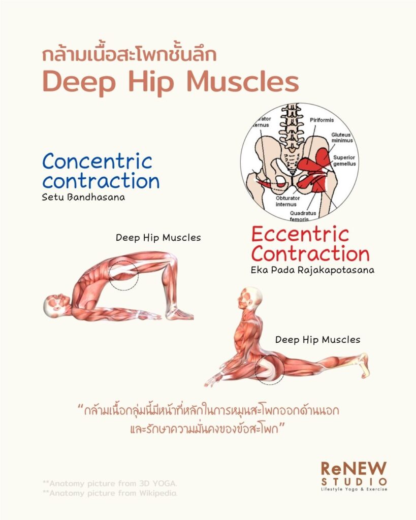 -Obturator Internus: ทำหน้าที่หมุนสะโพกออกด้านนอก และช่วยเพิ่มความมั่นคงและเสถียรภาพของข้อต่อสะโพก