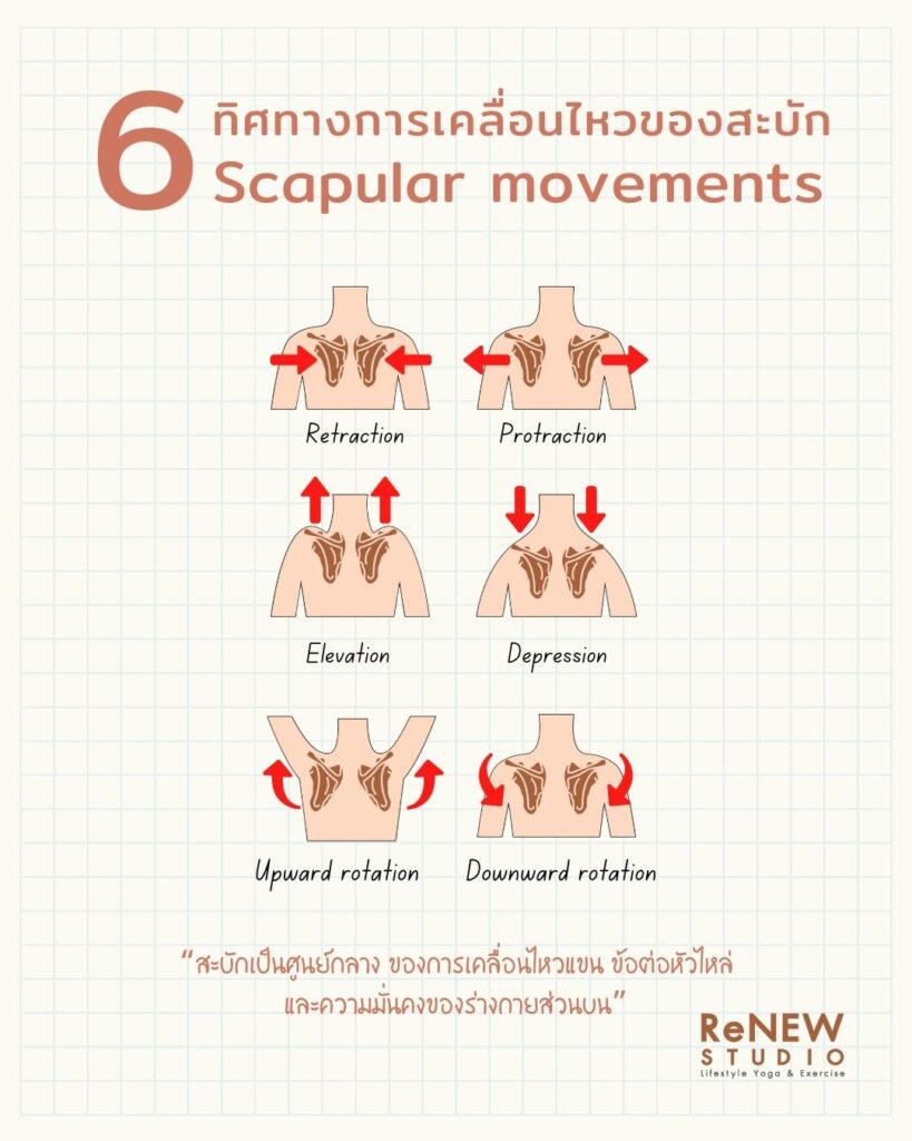 สะบักมีการเคลื่อนไหวหลัก 6 ทิศทาง ซึ่งช่วยสนับสนุนการเคลื่อนไหวของไหล่ ได้แก่
